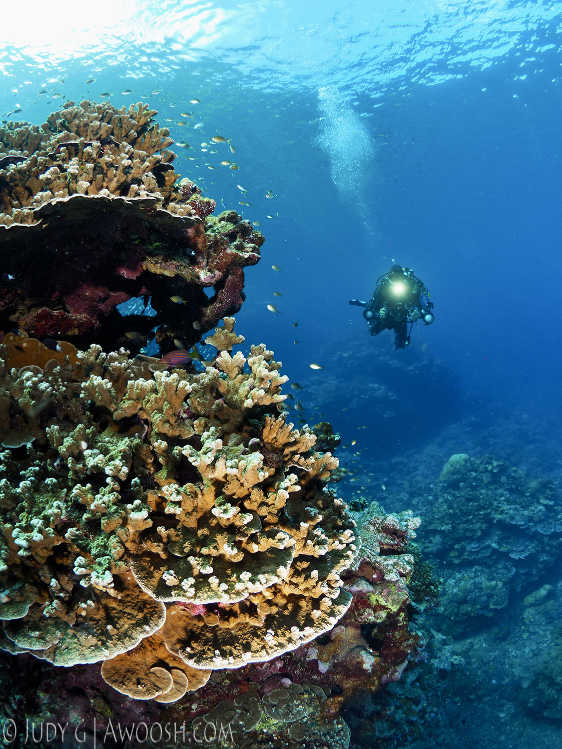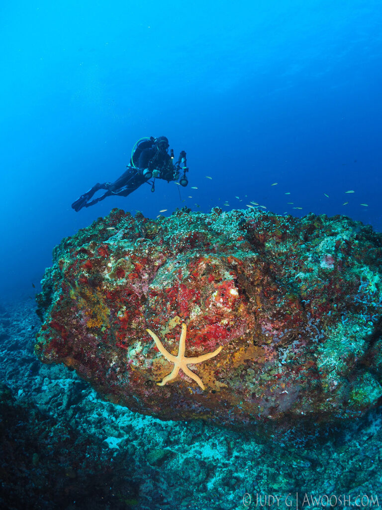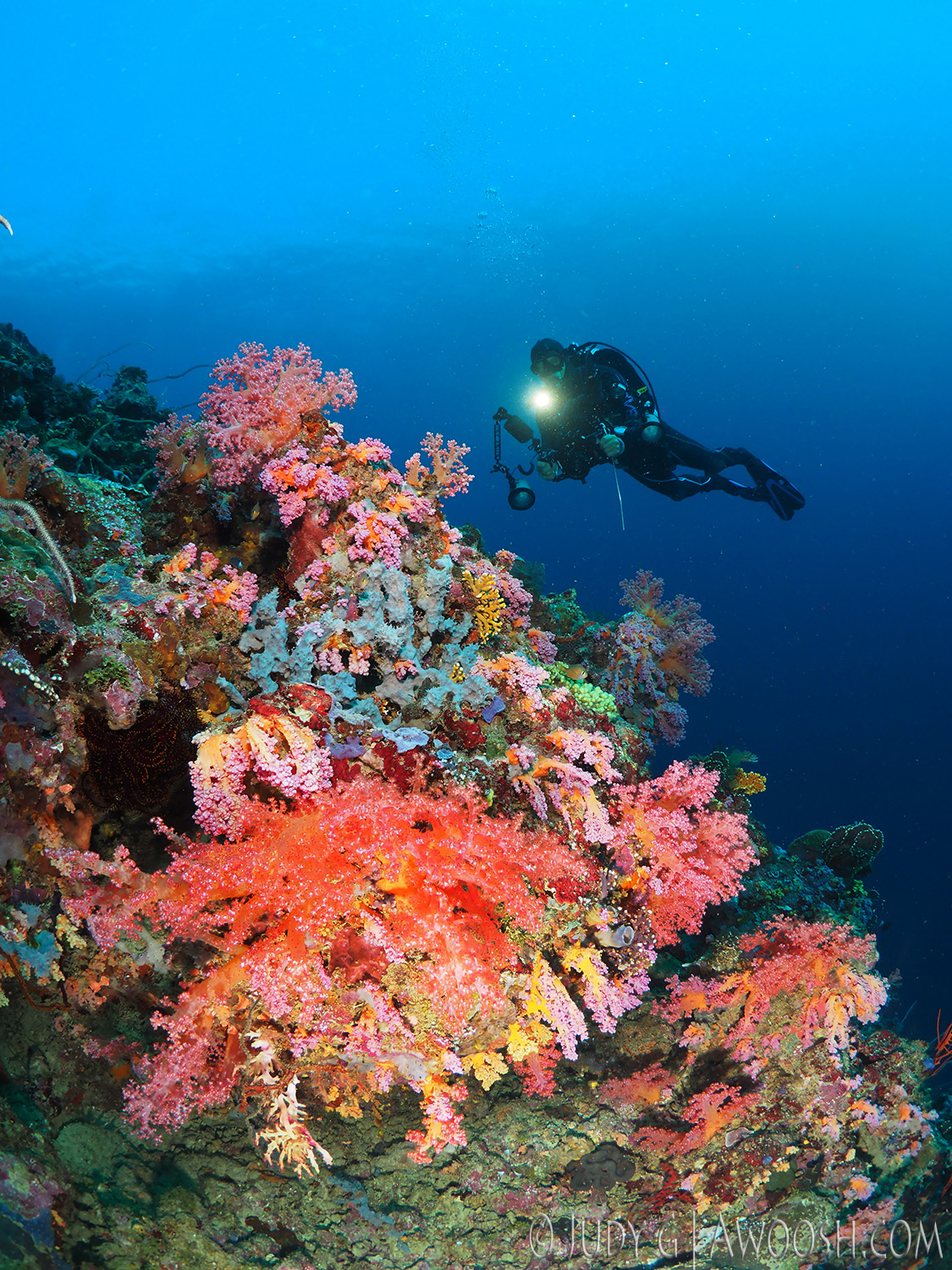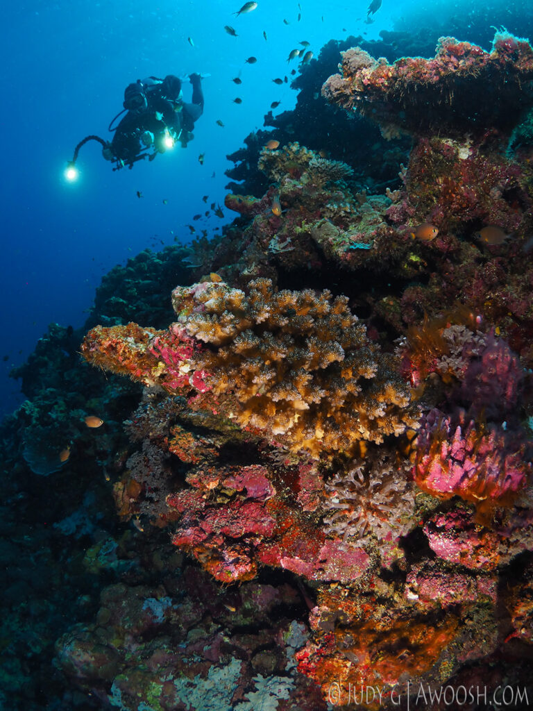We dove here, there, and everywhere — too many dive sites to list individually. I personally did 30 dives in the 9 diving day trip, and there were more on offer that I sat out (the night dives). All of the gang (except one newer diver) dove Nitrox, which was consistently delivered at 32%, and the Bilikiki wisely includes it in their trip price at no added cost. Nitrox (air enriched with extra oxygen) is pretty much essential on these multiple dives per day, over multiple days of diving, trips.