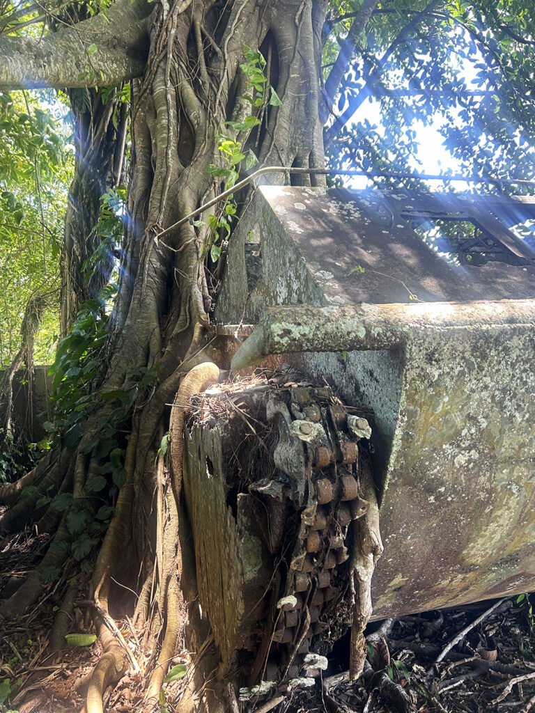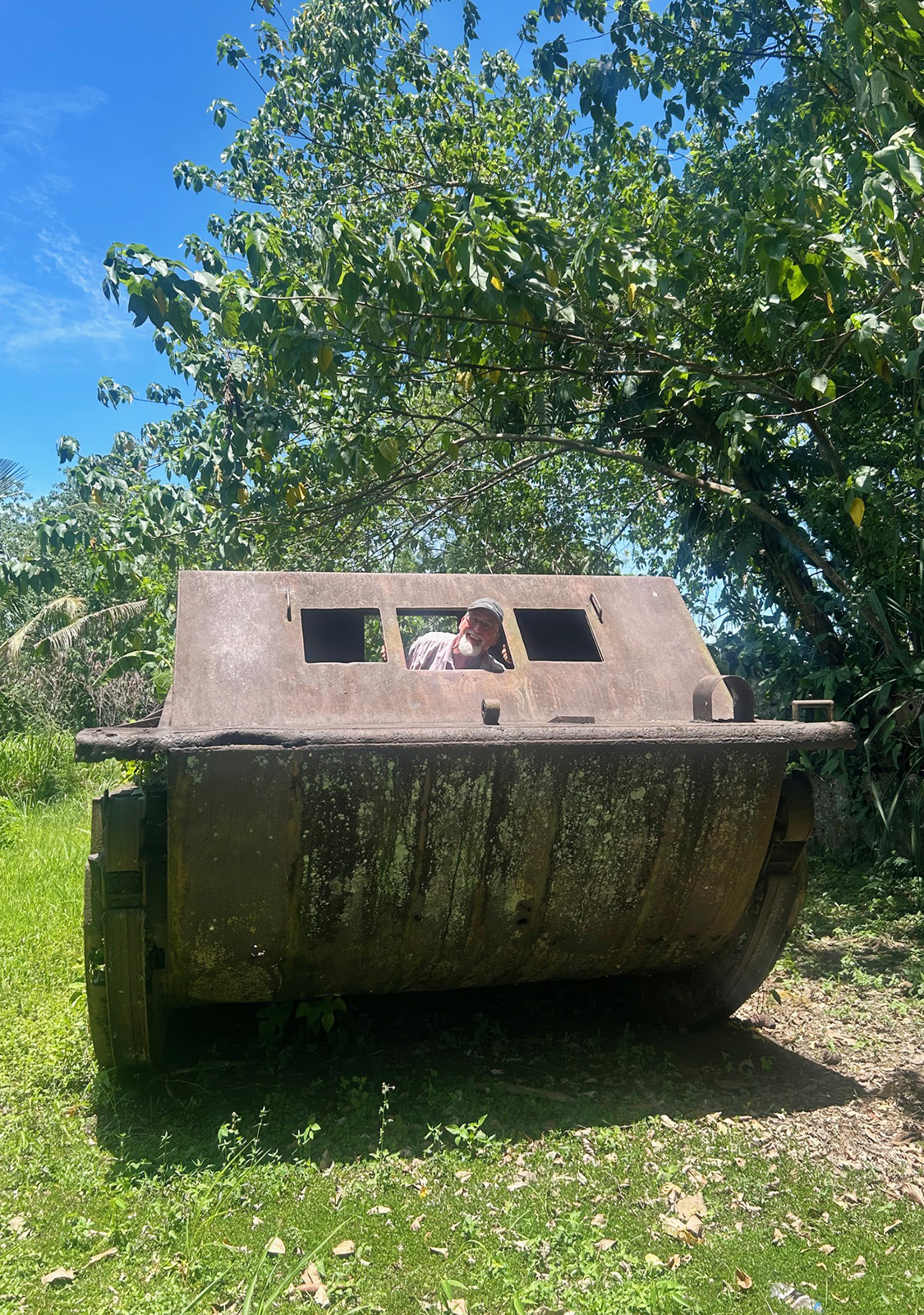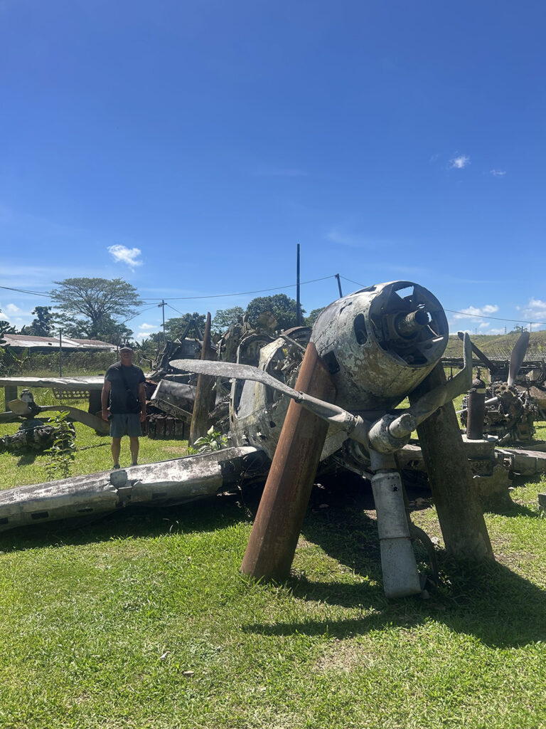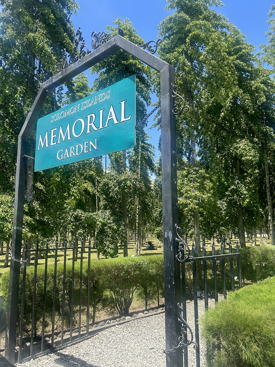 Thanks to the return flight rescheduling, some of us had an extra day to hang out in Honiara after getting off the boat. We decided to do a WW II tour (that got good reviews online) – we had done something similar in Palau, and it had been interesting, and sobering, to see some of the infamous battle and hideout locations. This 5 hour tour took us in and around Honiara, up to an informative US Memorial on the top of a hill not far from the town, and then to the very minimalist Japanese memorial not far from it. From there were driven to see some (now deeply decayed) bits of planes and tanks and other war detritus that is strewn around various collection sites. We also visited a US memorial garden, with rows of planted trees and dedication plaques below them. It’s a nice, leafy oasis, right next to the airport.