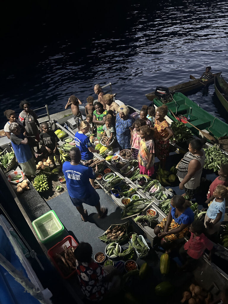 Like in so many island nations, the flat lands closer to the sea are patchwork quilts of small farms and big grow ops — most of which are coconut, palm oil and cacao groves in the Solomons. Gashes in the sides of mountains and in river basins mark where men and machines have scoured off the jungle and then butchered the ground below it, in their quests for precious metals and minerals. We were told by a cultural guide that this kind of industry is most often being undertaken by offshore interests, with little to no benefit to the local peoples, nor with apparent concern for the consequences of their huge excavations to the downstream communities.