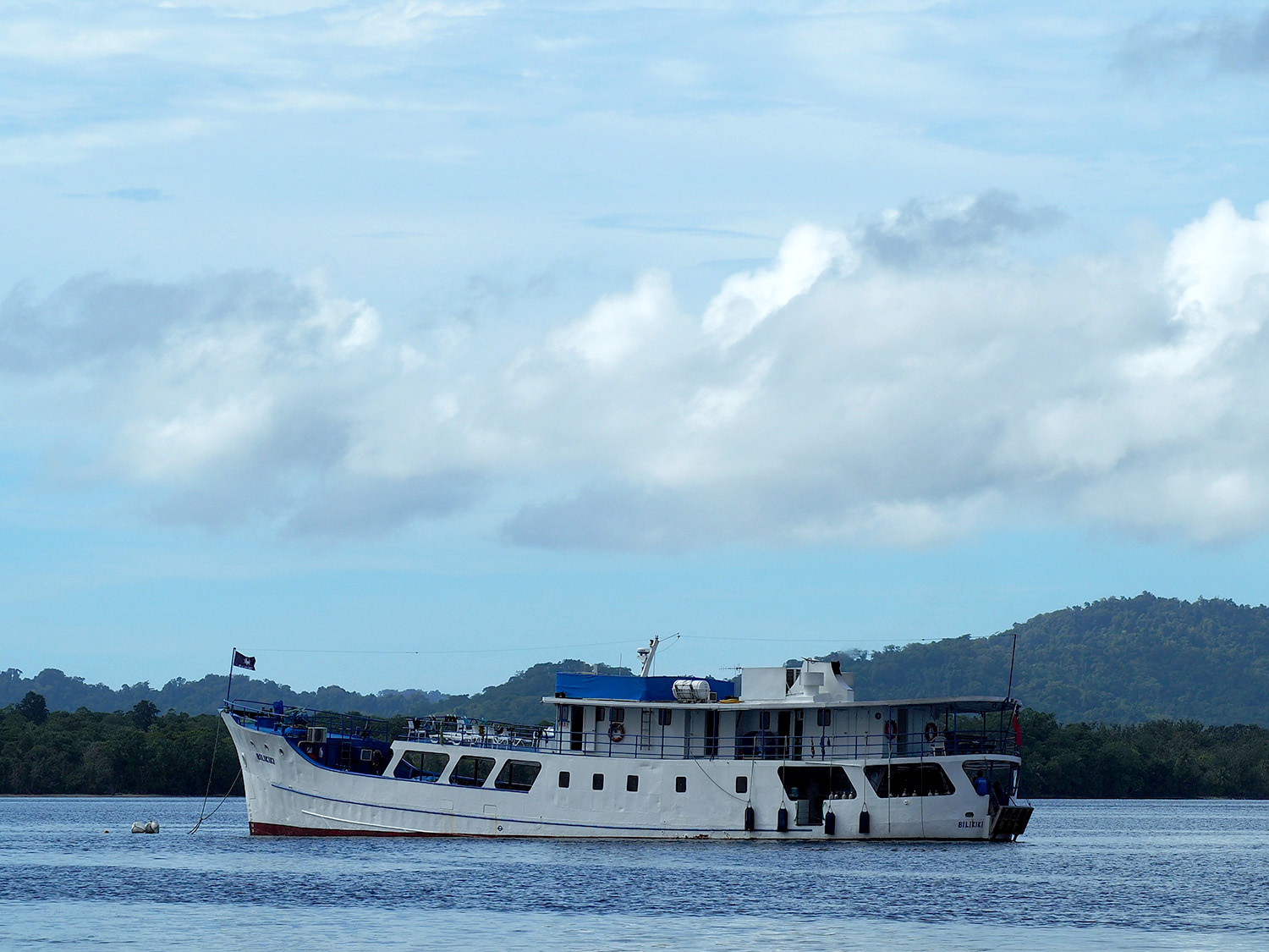 The Bilikiki is 125 feet long. She has 10 air conditioned passenger cabins, all of which are pretty basic, and all below decks. They are ensuite with sink, toilet and shower. Unfortunately there is no loo on the main lounge/dining/dive deck, so it’s a bit of a scoot down to the cabins for a potty break. The air conditioned lounge has indoor dining tables if inclement weather, plus there’s a large, covered, open air dining area. All of our meals were served buffet-style, and the food was good. Up top there’s a generous sun deck with comfy loungers.