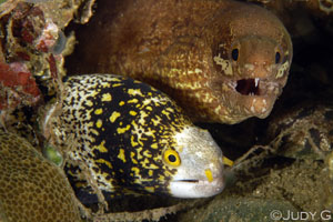 Seraya Secrets Well, the secret is out — the muck diving right out in front of Scuba Seraya Resort is world class. I had never been muck diving before this trip to Indonesia, and Scuba Seraya offered a grand introduction. Unlike the "dirty" (but fantastic) muck dives described by Mike in his Archipelago Adventurer II report, and Wendy in her Ambon report, the muck in front of the resort is not so much filthy — just an expanse of fine volcanic sand, which, at first glance, I will admit induced disappointment in me. I am a big picture kind of girl. One of the things I love most about diving is the view — the structural beauty of coral reefs, the dramatic landscapes of the underwater world (walls, seamounts and bommies — best when decorated with colorful corals and lots of fishies) are a huge attraction for me, and I love to attempt to capture their natural beauty in photographs. Before this trip, I had never really done much macro photography — lacking patience, and suffering middle-age-onset vision deterioration, I was not particularly gifted at finding the small stuff, much less successfully capturing it with my camera. But when in Rome... So I screwed on my dusty 105mm lens (set to manual focus) and said a little prayer, for without a proper focus light (my bad) and with my crapped out eyesight, I did not think my chances of getting any decent shots were good. During a few previous outings with this lens, I had attempted to shoot it in autofocus, as I have no doubt that my old, beat up Nikon D100 has better eyes than me, but I found it incredibly frustrating as the lens whirred in and out, in and out, trying to find the tiny subjects. So, it was going to be manual focus, or bust. Skulling out over the sloping rubble and sand bank out in front of Scuba Seraya, I did not initially see the beauty. I saw few fish, and those that I did see were singles, not in schools. But my disappointment very quickly changed to excitement as our guide, Komang, started tapping his tank, showing us that amidst this rubbly, dun-coloured moonscape there were jewels. And what jewels there were — harlequin shrimp, frogfish, snake eels, crinoid shrimp, ribbon eels, a mind-blowing array of nudis, bobtail squid burrowed in the sand, ghost pipefish, pairs of eels sharing their lairs, mantis shrimp, Coleman shrimp and zebra crabs nestled into the outrageously colorful fire urchins dotting the sea floor — the list goes on... With only three of us taking photographs (Mr G is not so inclined) we were each able to take turns getting shots of Komang's great finds while the rest of the group waited patiently or roamed nearby to seek more stuff. I watched Cindy, who is a master at this muck diving thing, and observed how she used her muck stick (Tip #6 - don't leave home without one) as a bit of a monopod, or a perch, to keep her and her camera up off the silty bottom. I'll admit there were times when I wasn't quite sure what exactly it was that we were photographing, but my faith in Komang, who has clearly been around this block many times, did not waiver — I knew if he pointed it out, it had to be something special. We dove day, we dove night, we went deep, we went left, we went right, we fought current, and on one dive we found ourselves in a strange cold and cloudy upwelling at 70 feet. We hung out at the jungle gym — a metal geodesic dome structure, dropped in 30 feet of water, that is encrusted with all sorts of groovy stuff, including some colorful soft corals hosting soft coral crabs. We watched the many batfish play with our bubbles and open wide to get their mouths cleaned by little cleaner wrasse. For such an at-first-glance wasteland, this place is teeming with incredible life.