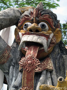 Hello Bali! As I mentioned in the Introduction to this epic group effort trip report, Mike Southard, Cindy Abgarian, Mr G and I spent a few days at Scuba Seraya on Bali, before meeting up with a chunk of the group at the Sofitel Resort in Seminayak (a resort town approximately 20 minutes from Bali's Denpasar airport). We spent the night at the Sofitel so as to be close to the airport for our flight out to Ambon to meet the Archipelago Adventurer II early the following morning. The lovely Scuba Seraya Dive Resort is located on the northeast coast of Bali, near the town of Tulamben — approximately a two and a half hour drive north of Denpasar Airport. And what a crazy drive it is. For tourists, renting a car and driving oneself around Bali can only be for the truly insane, er, intrepid ;^). The traffic snarls in southern Bali, and the rules of the road faithfully ignored by the Balinese (not to mention that they drive on the "wrong side of the road" in this part of the world), makes for a hair-raising journey, even in the back of the bus, any time of day or night. In fact, Scuba Seraya's owner himself, Patrick Schwarz, a Swiss ex-pat, was very seriously injured a few years back, just outside the driveway into the resort, when an on-coming truck thought it could get by his small car on a narrow, one-lane bridge (since upgraded to two lanes). He told us that while he lay broken in the local hospital, traffic injuries arrived with almost unbelievable frequency - most often scooter riders, who never win in a physical altercation with another vehicle. Cindy had visited Bali previously, and had stayed at Scuba Seraya for a few days between visits to Wakatobi and Lembeh, and highly recommended it — so much so that she was eager to return. She advised us that the best way to get to the resort was to arrange for the resort's van and driver to meet us at the airport to transport us. Iis (pronounced eye-eese), the Manager of the Scuba Seraya booking office (which is located in the town of Sanur — quite distant from the resort itself), was a most prompt e.mail correspondent in all matters regarding reservations, transport and any other queries regarding a stay at the resort. She was most able and willing to arrange any transfers to get us to and from the airport, as well as arrange an add-on excursion that we requested on our way to Seminayak, at the end of our stay. Anyhoo, so there we finally were, being met by the Scuba Seraya driver (the laconic but kind Alit) at Denpasar Arrivals, a bit exhausted after a long-way-around commute from Canada (traveling in Aeroplan points seats), and having endured the boondoggle that is Indonesian Customs & Immigration (more about that in the Appendix of this report). But, instead of being lulled into a stupor by the beautiful views of the verdant jungle and rice paddies, with glimpses of the glorious Indonesian sea around one bend, and soaring volcanoes around the next, I can tell you that I was on high alert and cringing every time scooters passed us (on the curb side — watch out for those soft shoulders folks!). I was white-knuckled as on-coming traffic leap-frogged around slower moving vehicles by coming at us, with grim determination, head on, in our lane. Did I mention the large population of apparently road-savvy Indonesian small children and dogs, who seem to know exactly when to time their veer off the road so as to avoid becoming roadkill? Aye Carumba! And you thought Mexico was gnarly... Families of four or more stacked onto belaboring scooters, tottering open trucks laden with sugar cane, baskets of fish, school kids, farm workers, goats, watermelons (I think you've got the picture) clog the roads. Horns sounding constantly, not with New York impatience, but as a warning to other drivers that one is about to make a move. The incessant honks and beeps created a Pavlovian response in me — heart rate increase, cold sweat, the occasional gasp of fear — and scored an unforgettable soundtrack for our journey north. Welcome to Asia. As we left behind the more congested areas of Bali, to the south, we transited through farming country — sugarcane plantations, banana plantations and the beautiful, tiered rice paddies that are ubiquitous with the word Bali. Sun, tropical downpours of rain (and so, not surprisingly, rainbows) engulfed us. Late afternoon magic light illuminated the steeples of volcanoes as they peeked out of their shrouds of tumescent clouds. It was glorious. The countryside is dotted with modest seaside resort towns and small villages, huddling up to the main road, front doors opening within feet of the speedy through traffic, with fragrant, smoldering offerings to Hindu gods placed in front of each one. Each dwelling, no matter how humble, has a large stone temple, its base wrapped in a colorful swatch of fabric, prominently on display. Dogs, goats, beautiful children, women in traditional Balinese dress balancing huge loads on their heads (look Ma, no hands!) and legions of Balinese men, shirts rolled up to cool their bellies, sitting, smoking and perfecting the art of doing nothing, all whizzing past us in a visual feast. Yes, Judy, you are not in Canada any more. Finally, in the waning minutes of daylight, we turned down the short driveway to the resort, and found ourselves in the haven of the Scuba Seraya property, being welcomed by Komang, the very accommodating resort Manager, and several of the staff who all hurried out to greet us and to expediently roll our bags out of the mini-bus and into our rooms. A cool fruit drink was immediately offered as we were invited to sit down in the dining area and fill out our dive waivers. You want to dive right away? No problem. Cindy, Dave and I were much too whacked to take them up on it (I was only up for a beer, dinner and a pillow), and Mike was arriving late that evening, but good to know...