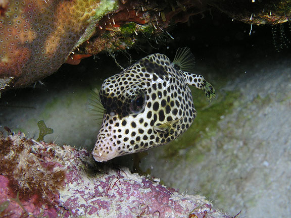 Red Slave was still a nice dive, but the night dive that evening was just strange. I can’t remember name of the site (I have quit logging dives), but we ended up on a steep wall that bottomed out at about 80 feet. As we went over the edge of the wall, we check for current and after reaching about 50 feet headed to our right. Almost immediately, Dave’s light flooded and quit. So, my gear jinx was spreading out to other people now, maybe it would leave me alone for a while. I lent him my spare light, and we continued. After a few minutes into the dive, I noticed the soft corals bending in the same direction we were heading. Somehow the current has reversed, and was now following us, and this was a pretty stiff current by Bonaire standards. We agreed to turn the dive early, at 2000 pounds, knowing we had a pretty good swim ahead of us. We ascended to the top of the wall at about 25 feet, and soon realized that the current was at our back again! The current swept us right along, and shortly we were back at our entry point with 1500 pounds left. It was like taking a circular route on a bike, and realizing you went downhill the whole trip. I assume we had a direct on-shore current, and when it hit the wall it spread into both directions depending on the depth. I didn’t mind at all though, because we just noodled around in the shallows for the rest of the dive and I got some nice pictures.